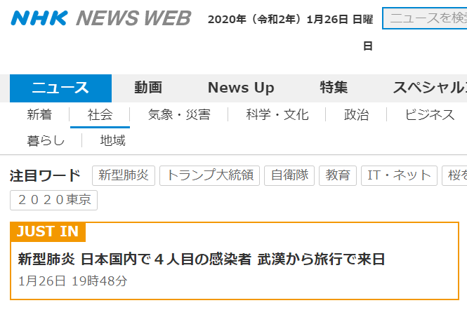 【环球网快讯】日本广播协会(NHK)刚刚援引日本厚生劳动省消息称,当地时间26日,日本确诊第4例新型冠状病毒感染肺炎病例。患者为一名40多岁居住在武汉的男子,该男子22日来到日本旅行后,因出现发烧等症状住院治疗,最终于26日被确诊为感染新型冠状病毒。