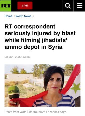 今日俄罗斯电视台披露,受伤的记者为该电视台阿语频道的女记者瓦法·沙卜伦内。当地时间29日,她在对刚被叙利亚政府军收复的伊德利卜省重镇马雷特努曼进行探访时遭遇炮击。