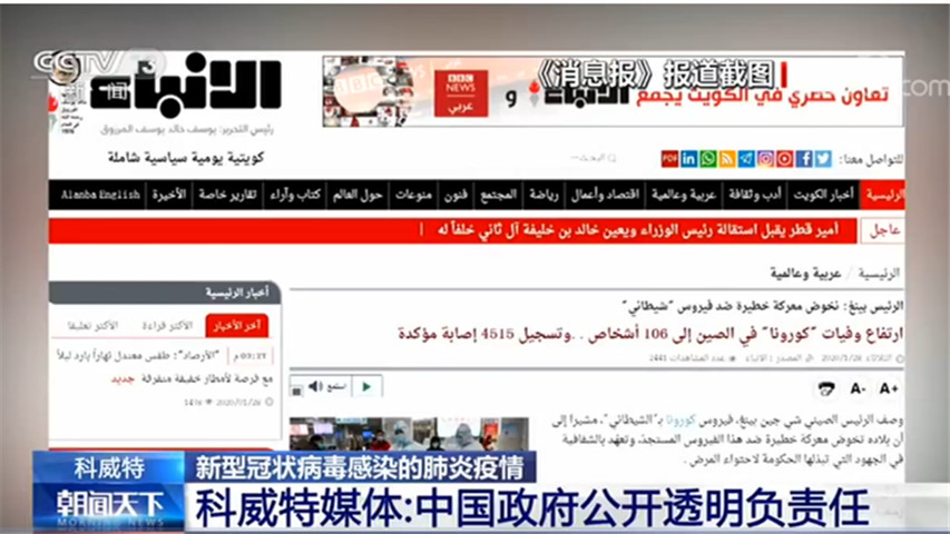 央视网消息:连日来,沙特、科威特、泰国等多国媒体关注了中国新型冠状病毒感染的肺炎疫情发展情况和防控措施,并积极评价中国在防控疫情方面作出的努力。