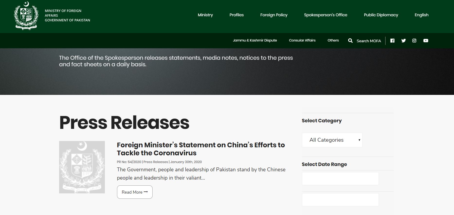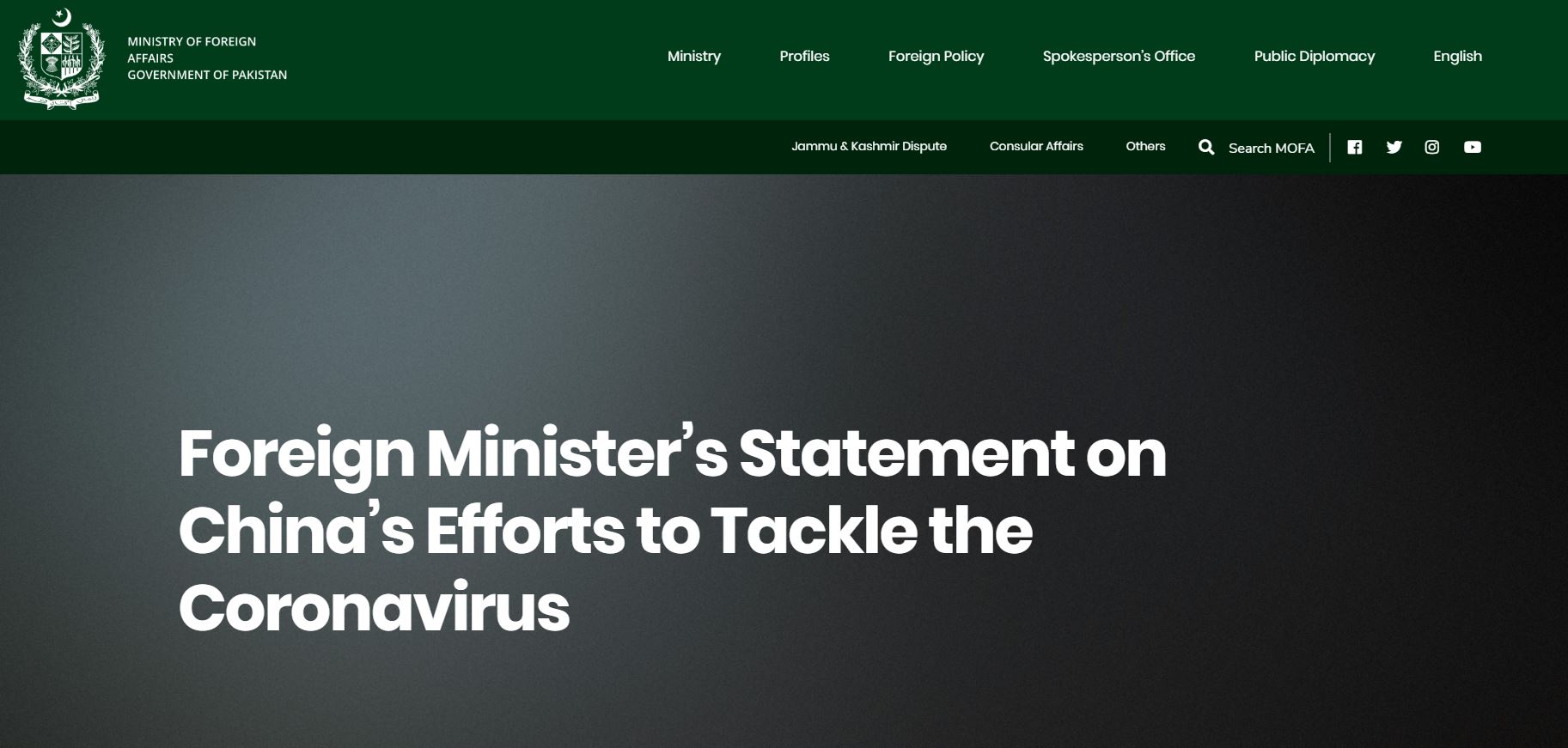 当地时间1月30日,巴基斯坦外交部部长在官方网站上就中国应对新型冠状病毒的努力发表声明。声明说: 当中国人民和领导人为控制新型冠状病毒作出英勇的努力时,巴基斯坦政府的人民和领导人和他们在一起,并支持中国在这方面采取的措施。
