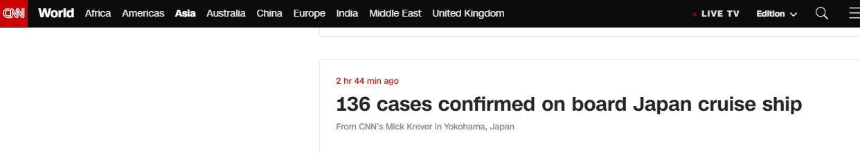 据悉,该游轮于1月20日从横滨出发,25日抵达中国香港。之后前往越南等地,2月1日停靠在那霸,最后抵达横滨。一名香港乘客于横滨登船,从香港下船后被确诊感染。2月3日晚游轮到达横滨后开始了大规模检疫。