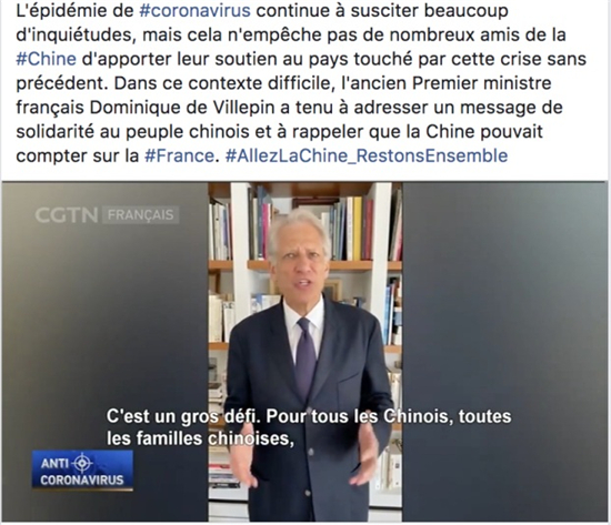 当天,法国前总理德维尔潘接受总台视频连线,对中国抗击新型冠状病毒疫情表示支持和钦佩。法国前总理拉法兰表示,坚信中国人民一定能打赢这场战“疫”。法国驻武汉总领事贵永华在武汉封城之际提前结束休假,回到武汉主持总领馆志愿工作组。贵永华总领事在总台视频连线时特别提到,“我相信患难见真情”。