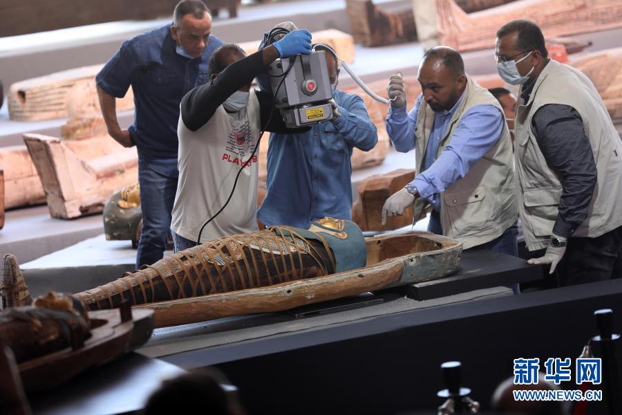 11月14日,在埃及吉萨,考古工作人员对木棺内的木乃伊进行X光检查。埃及旅游和文物部长哈立德·阿纳尼14日宣布,在吉萨省塞加拉地区出土100具距今约2500年的彩绘木棺,这是埃及本年度最大的考古发现。新华社发(艾哈迈德·戈马摄)