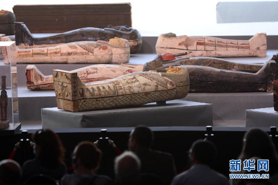 这是11月14日在埃及吉萨拍摄的彩绘木棺。埃及旅游和文物部长哈立德·阿纳尼14日宣布,在吉萨省塞加拉地区出土100具距今约2500年的彩绘木棺,这是埃及本年度最大的考古发现。新华社发(艾哈迈德·戈马摄)