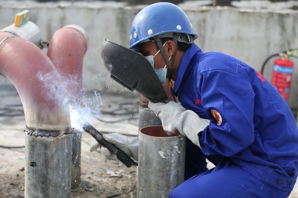 觉泰昂是正在接受项目组培训的当地工人之一。他刚来项目组上班时仅是一名普通的安装工,因为他对电焊感兴趣,又掌握一些基本的焊接知识,项目组的师傅就开始教他做些简单的焊接工作。教觉泰昂电焊技能的师傅田志章说:“提前帮他调好尺寸,接好焊点,每焊两厘米左右就帮他检查一下,一般的支架和管道焊接他已经能做得很好。”