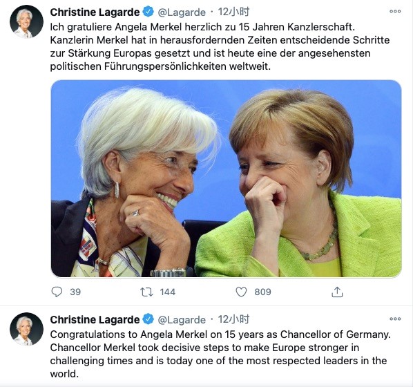欧洲央行行长拉加德22日在社交媒体上分别用德语和英语对默克尔执政15周年表示祝贺,称其为“怒浪中的磐石,全球女性的榜样”。她写道:“在当前充满挑战的时期,默克尔总理始终致力于让欧洲变得更加强大,是世界上最受尊敬的领导人之一。”