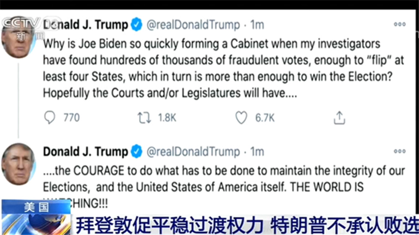 另据美国有线电视新闻网22日报道,佐治亚州在重新计票后宣布拜登在该州以微弱优势击败特朗普,两人得票率差距在0.5%之内,特朗普竞选团队按照该州法律,要求再次重新计票。21日晚,特朗普在社交媒体发文称,为什么拜登这么快就想组建内阁?调查人员已经发现了数十万张欺诈选票,足以扭转至少四个州!推文发布后不久,就被社交媒体贴上了关于选举舞弊的说法存在争议的标签。