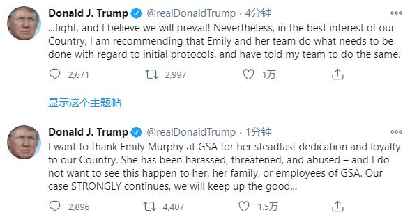 特朗普在推文中写道:“我要感谢总务管理局(GSA)的的艾米丽·墨菲,感谢她对国家的坚定不移的奉献和忠诚。她受到了骚扰、威胁和虐待--我不希望看到这种情况发生在她和她的家人或者总务管理局的员工身上。我们的诉讼还在继续,我们会继续不懈努力。”