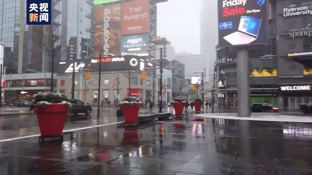 22日,多伦多迎来降雪,由于大量商业和服务设施已经提前停止运营,加上降雪,街道上的行人比平时少了很多。不过,根据规定,进入封锁状态后,依然有一些商业设施,比如超市、商店等会继续营业,餐馆不允许堂食,但可以继续提供外卖服务和汽车自取服务。