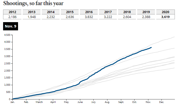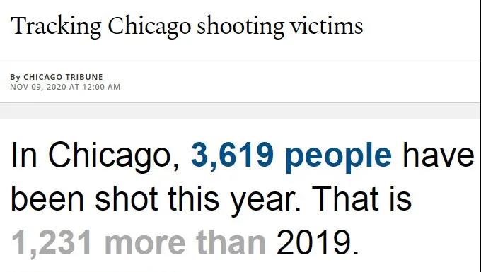 △《芝加哥太阳报》:截至11月9日,芝加哥今年已有3619人遭枪击,比去年全年还多1231人