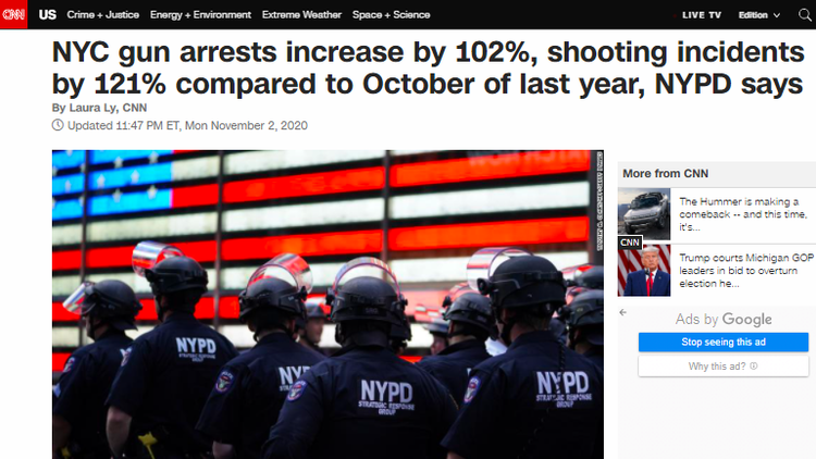 另据美国有线电视新闻网(CNN)援引警方数据报道,纽约市10月共发生137起枪击案,比去年同期大幅增长了121%;与此同时,总体涉枪犯罪案件达502起,同比增长了102%。数据还显示,今年以来纽约市已经发生约1300起枪击案,总体涉枪犯罪案件约3300起,比去年同期分别增长了94%和15%。