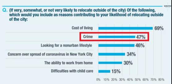 △曼哈顿研究所数据显示,47%的受访者因害怕犯罪的发生而考虑离开纽约市,仅次于因生活成本太高而离开的人