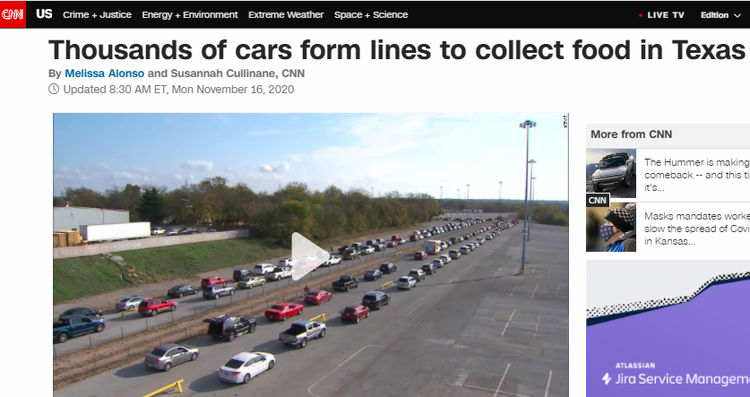 △美国有线电视新闻网(CNN):在得克萨斯州达拉斯市,数千辆汽车排队等待从当地食物赈济中心领取食物