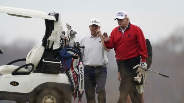 特朗普(右)21日在G20视频峰会短暂露面后到弗吉尼亚州斯特灵打高尔夫球(美联社)