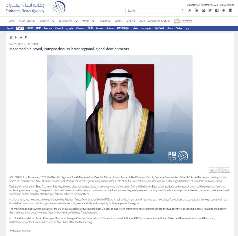 相对于被土耳其政府公开“打脸”,蓬佩奥的阿联酋之行显得波澜不惊。11月20日,蓬佩奥到达阿布扎比,短暂的一天行程,阿联酋的接待中规中矩,阿布扎比王储默罕默德会见蓬佩奥之后,阿联酋的官方通讯社阿通社发了一篇不长不短、毫无新意的新闻稿。这恰恰也是一种态度,毕竟阿联酋已经祝贺过拜登当选,所以会谈的主要内容之一是回顾2019年10月的美阿战略对话。不得不说,在阿联酋,双方维持颜面“尬聊”的水平还真是不低。