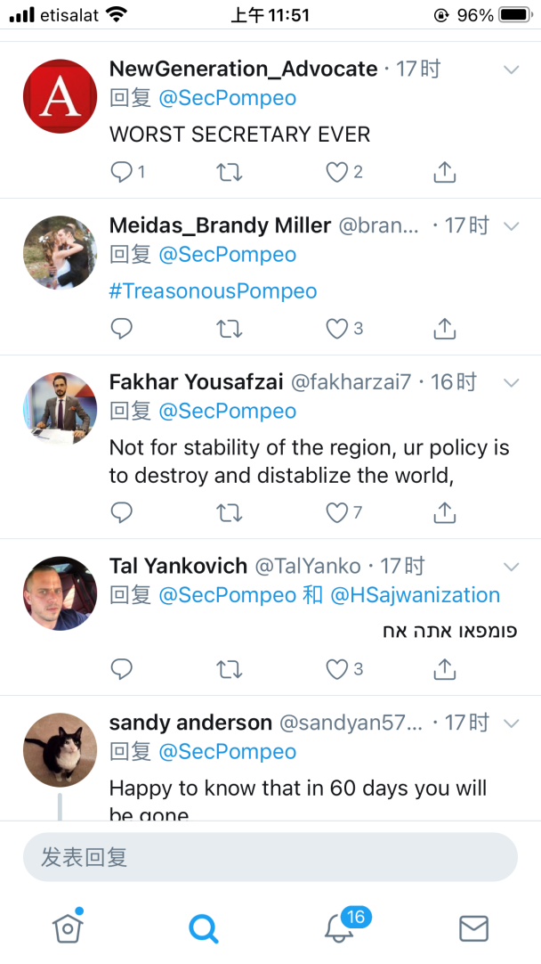而蓬佩奥访问阿联酋的推特消息下面,网友的评论是这样的: