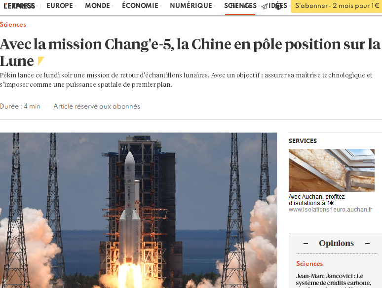 法国《快报》当地时间11月23日发表了一篇题为《“嫦娥五号”任务使中国在探月领域处于领先地位》的文章。该文章引用孔子的名言“君子欲讷于言而敏于行”,称中国航天技术已实现了突飞猛进的发展。