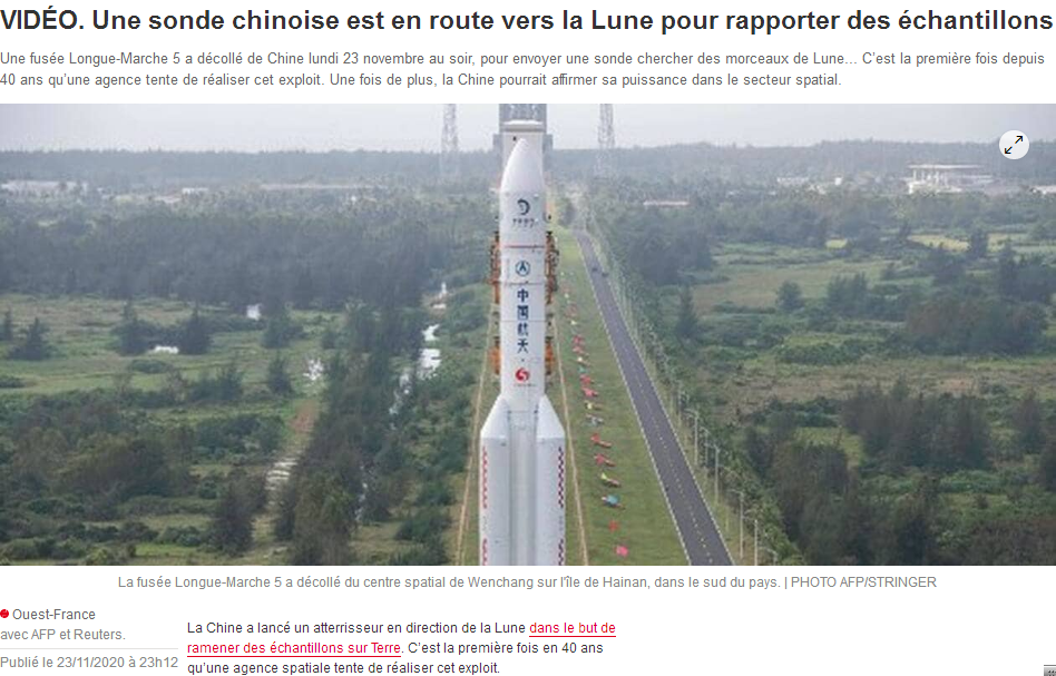 《法兰西西部报》当地时间23日报道,中国“嫦娥五号”探测器发射成功,是前苏联发射“月球24号”探测器成功带回月球样本44年后,再次有国家尝试从月球采样返回,如若成功,中国将有力证明其在航天领域的实力。