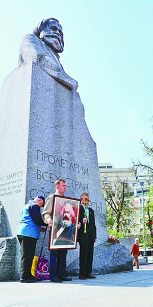 5月5日,俄罗斯共产党及部分左派政党组织民众向位于莫斯科市中心的马克思雕像献花,以纪念马克思诞辰200周年。光明图片/视觉中国
