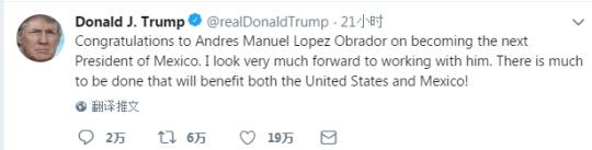 早些时候,特朗普在推特上就洛佩兹 奥夫拉多尔赢得选举表示期待与其合作。他写道:“祝贺安德烈斯·曼努埃尔·洛佩兹·奥夫拉多尔成为墨西哥下任总统。我非常期待和他一起工作。我们有很多对美国和墨西哥都有利的事情可以做!”