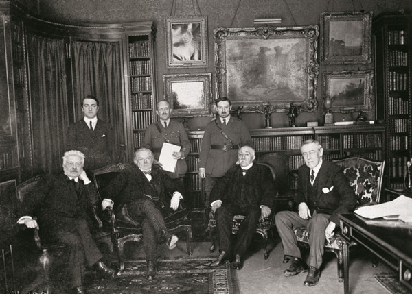 1919年,巴黎和会期间,美国总统托马斯·伍德罗·威尔逊(前排右一)与参会的其他国家领导人。