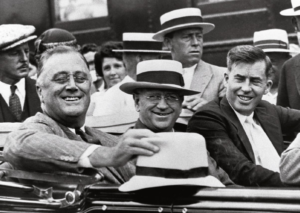1933年,美国总统富兰克林·德拉诺·罗斯福(左)与内政部长哈罗德·L·伊克斯(中)、农业部长亨利·A·华莱士(右)乘坐一辆汽车。当时正值罗斯福新政初期。