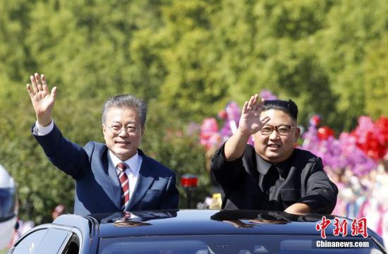 韩国总统文在寅9月18日抵达朝鲜平壤,今年第三次“文金会”将于9月18日至20日举行。图为9月18日,文在寅与金正恩一同驱车平壤街头,二人打开天窗,向民众挥手致意。 平壤联合采访团供图
