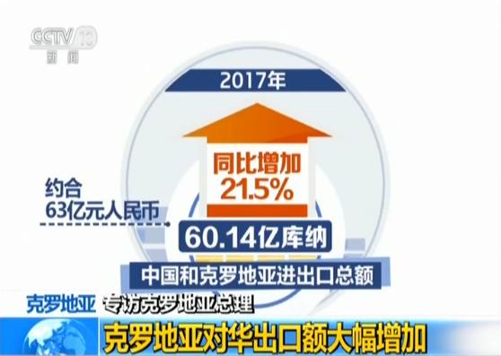 根据克罗地亚国家统计局的数据显示,2017年,中国和克罗地亚进出口总额60.14亿库纳,约合63亿元人民币,同比增加21.5%。其中,对华出口8.36亿库纳,约合8.8亿元人民币,同比大增46.5%。普连科维奇表示,克中两国在经贸方面仍有很大的合作空间。