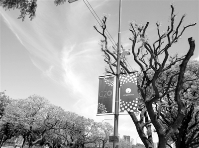 布宜诺斯艾利斯大街遍植蓝花楹,不久前挂上G20会议标志。本报记者 李山摄