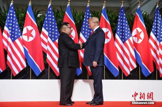 资料图:2018年6月12日,朝鲜最高领导人金正恩(左)与美国总统特朗普在新加坡举行会晤。中新社发 新加坡通讯及新闻部供图 摄