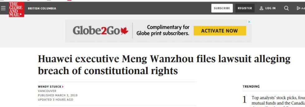 《环球邮报》称,孟晚舟的律师团队周日(3日)发出一份声明,称已于3月1日向加拿大不列颠哥伦比亚省高等法院提起民事诉讼。