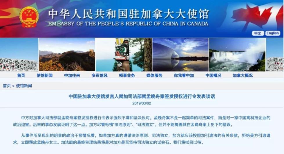 3月2日,中国驻加拿大使馆发言人就加司法部就孟晚舟案签发授权进行令发表谈话,全文如下: