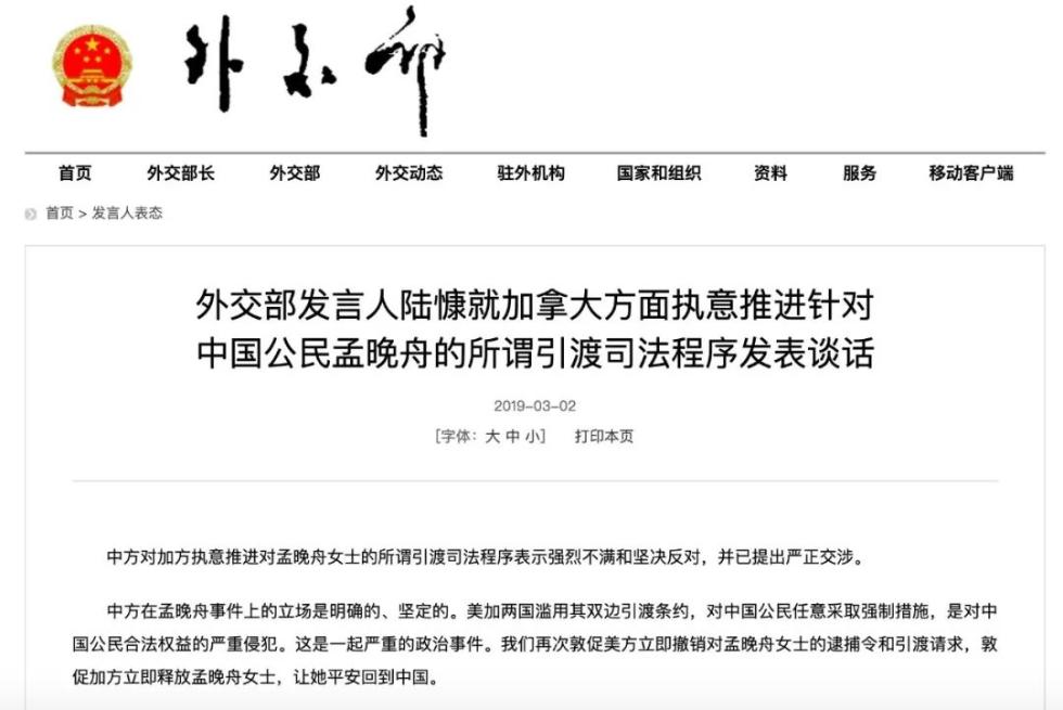 同一天,外交部发言人陆慷也就加拿大方面执意推进针对中国公民孟晚舟的所谓引渡司法程序发表谈话,全文如下: