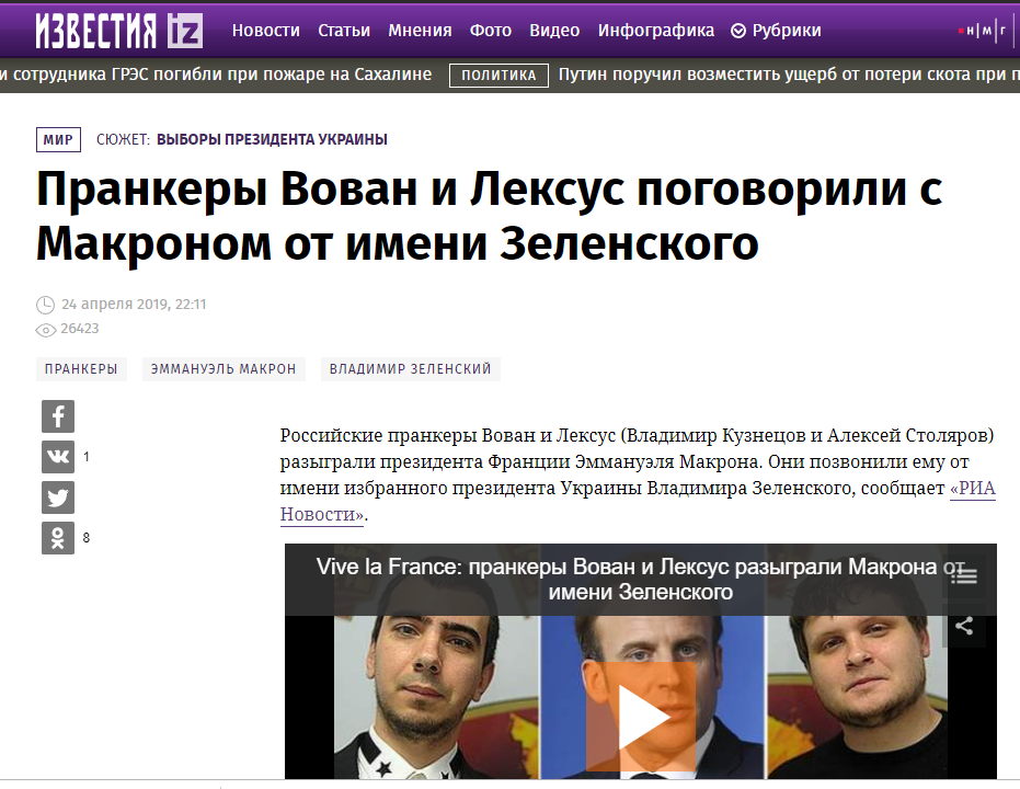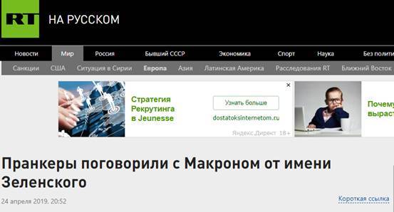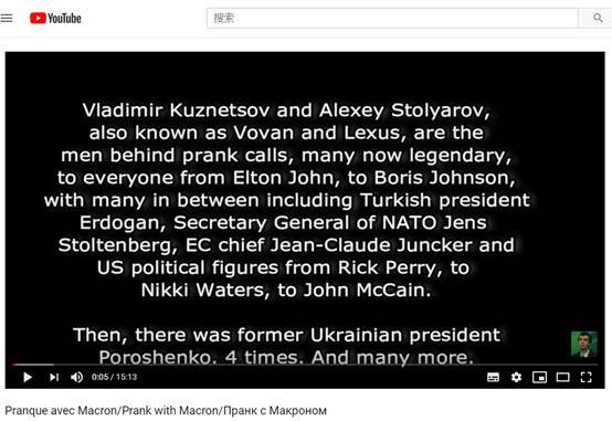 当天,他们在电话中冒充前不久才当选乌克兰总统的弗拉基米尔•泽连斯基,给马克龙打了电话,并在视频网站“YouTube”和脸书上发布了电话录音。
