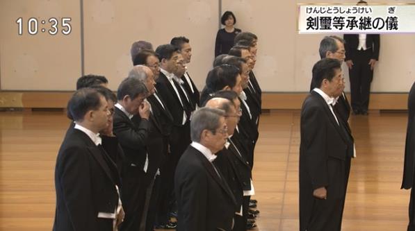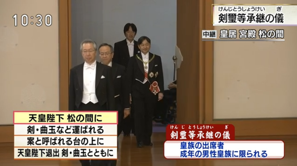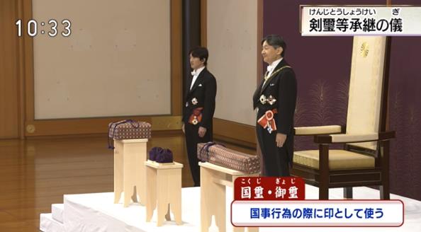 仪式间,德仁天皇首先走入宫殿中,随后由侍从依次将剑、勾玉,随后国玺、御玺4样象征物置于“案”上,德仁天皇向众人微鞠躬示意。稍作停顿后,侍从再将剑和勾玉取走,走出宫殿,德仁天皇跟随出宫后,其余两侍从取走国玺和御玺,整个仪式正式结束。