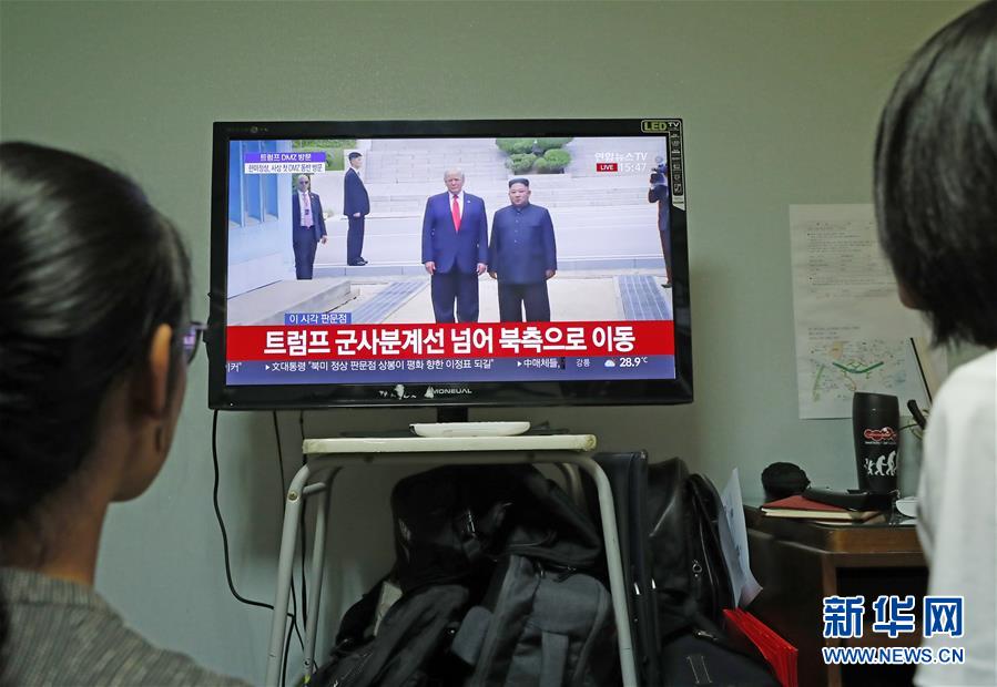 6月30日,韩国首尔市民在家里收看朝鲜最高领导人金正恩(屏幕右侧)与美国总统特朗普会面的电视直播。 据韩国媒体报道,美国总统特朗普30日在板门店与朝鲜最高领导人金正恩会面,这是两人继新加坡会晤和河内会晤后的第三次会面。 新华社记者王婧嫱摄