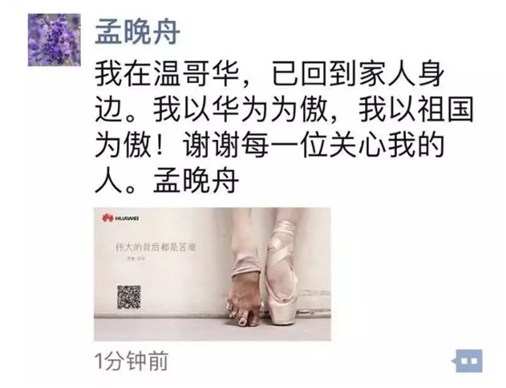 这并不是孟晚舟在被加拿大非法拘捕后首次发声。2018年12月11日,孟晚舟获得保释后就曾发朋友圈“报平安”。当时,孟晚舟写道:“我在温哥华,已回到家人身边,我以华为为傲,我以祖国为傲!谢谢每一位关心我的人。孟晚舟”
