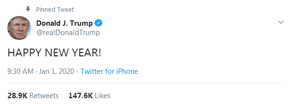 【环球网快讯】当地时间12月31日晚(北京时间2020年1月1日),美国总统特朗普在社交媒体推特上发文,祝大家“新年快乐”,并将这条推特置顶。↓↓