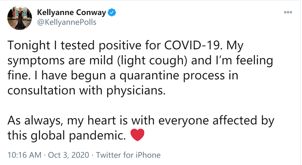 “今晚,我的新冠病毒检测结果呈阳性。我的症状轻微(轻微咳嗽),我感觉很好。”康威在推特上写道。