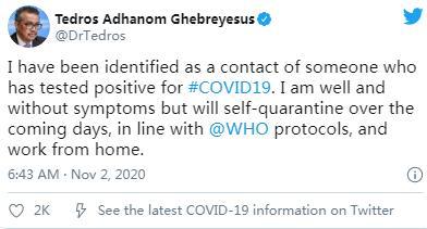 中新网11月2日电 据外媒报道,当地时间11月1日,世卫组织(WTO)总干事谭德塞称,他已确认与新冠患者接触,将进行自我隔离,并补充说,自己感觉良好,没有任何症状。
