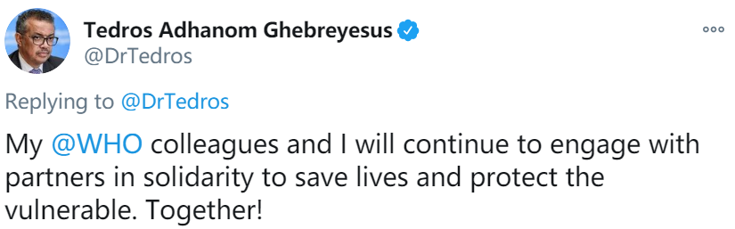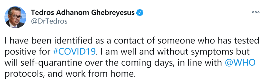 当地时间11月1日晚,世卫组织总干事谭德塞在个人社交媒体上表示,已确认自己曾接触新冠病毒检测阳性者。谭德塞目前身体状况良好,并无任何症状,将进行自我隔离,遵守世卫组织规定,居家办公。