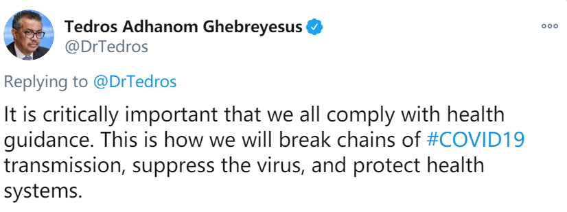 谭德塞强调,至关重要的是,所有人都遵守卫生指南,从而打破新冠肺炎传播链,遏制病毒并保护卫生系统,自己将同世卫组织其他同事继续与合作伙伴团结一致,拯救生命并保护弱势群体。(总台记者 朱赫)