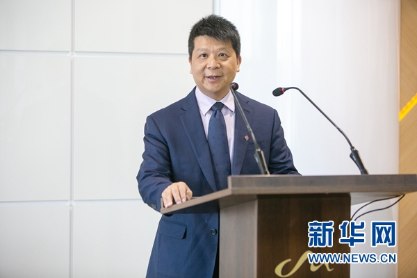 华为公司轮值董事长郭平在签约仪式上致辞。新华网记者魏忠杰 摄