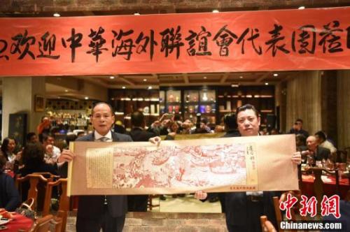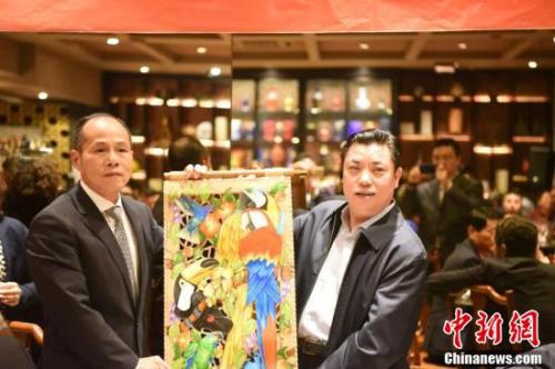 巴西华人协会会长朱苏忠(左)向中华海外联谊会副会长冉万祥赠礼品。