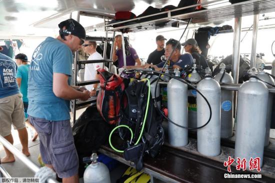 当地时间2018年7月7日,泰国吉岛海域附近,潜水员检查船上的氧气罐,准备进行搜救工作。