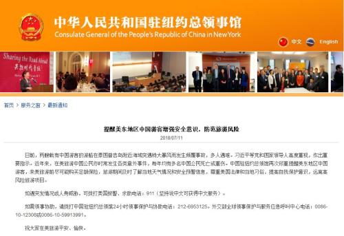 中新网7月13日电 据中国驻美国纽约总领事馆网站消息,日前,两艘载有中国游客的游船在泰国普吉岛附近海域突遇特大暴风雨,发生倾覆事故,多人遇难。近年来,在美旅游中国公民亦时常发生各类意外事件,每年均有多名中国公民死亡或重伤。中国驻纽约总领馆再次郑重提醒美东地区中国游客注意安全。