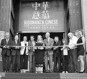 7月18日,在意大利罗马维多利亚诺宫,嘉宾为“中华意蕴——中国油画艺术国际巡展(意大利)”开幕剪彩。新华社发