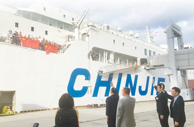 9月10日,中国驻大阪总领馆工作人员把因台风滞留日本关西国际机场的部分中国旅客送上助其返乡的“新鉴真”号。资料图片
