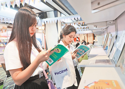 泰国诗纳卡琳威洛大学中文系的两名学生在展架前浏览中文图书。