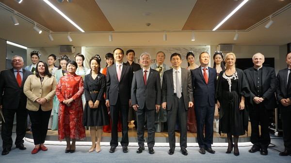 10月22日,在位于韩国首尔的中日韩三国合作秘书处,各国嘉宾在演出结束后合影留念。(首尔中国文化中心供图)